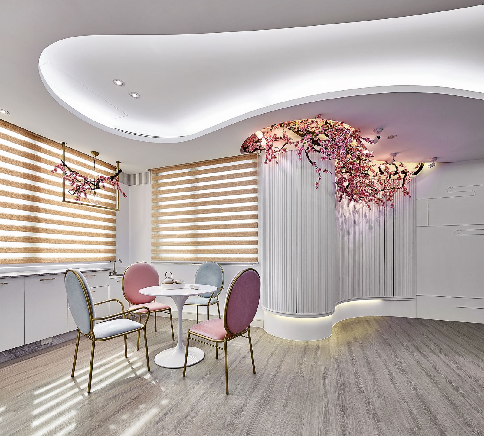 以東方固有的如意雲紋,恣意流淌於隔間壁面之上,並延伸於天花板造型上,以流暢的潔白照明,感受柔美的光影體驗。
