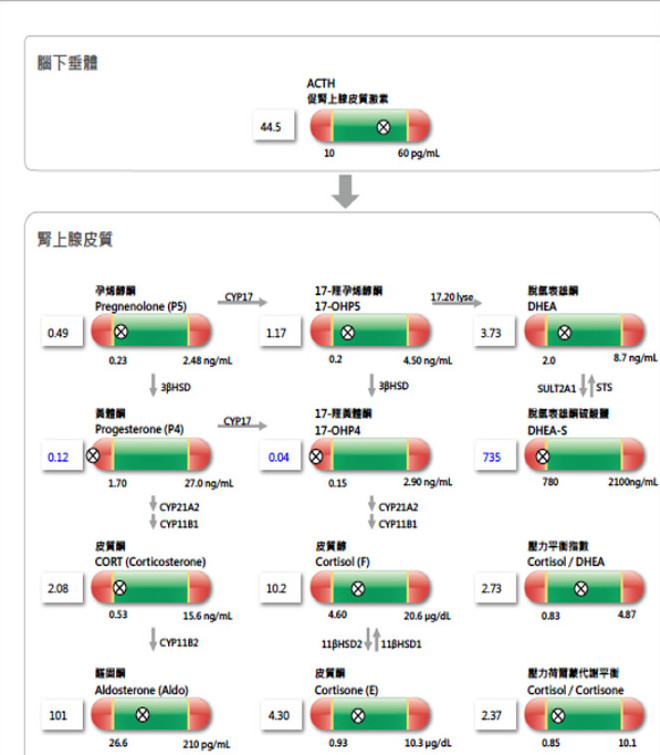 壓力會促使腎上腺皮質製造的皮質醇量增加。長期壓力則會導致焦慮、憂鬱、記憶力衰退、癒合能力受損、肌肉與組織退化、血糖代謝不良、肥胖、心血管疾病、免疫失調等。此分析可檢視與壓力有關的荷爾蒙分泌與代謝狀態,全盤性瞭解鹽皮質激素(如:醛固酮)、醣皮質激素(如:皮質醇)、抗壓指數、腎上腺儲備能力、壓力平衡指數、壓力荷爾蒙代謝平衡,作為現代人壓力疾病的指標。