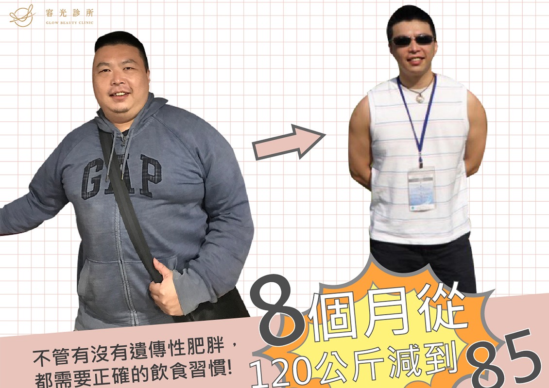 劉先生真實分享: 回想這8個月,從一開始護士幫我量體重,才發現體重已經120公斤,心想我這輩子從來沒這麼胖過,到現在成功減了35公斤!記得有次周建存醫師跟我分享喝酒其實等於喝油,1公克酒精產生7.6大卡熱量,我直接被嚇到,過去只知道喝酒會有肚子,但不知道酒的熱量這麼高;也因為家庭有糖尿病遺傳史,周醫師特別告誡我,必須少喝酒,減少酒精對胰臟的傷害,才能避免影響血糖的控制! 後來在周建存醫師的鼓勵下,我開始控制飲食,雖然應酬還是少不了,但只要那天有飯局,我白天就會刻意吃少,當下的飯局也只吃青菜,讓這一餐熱量熱量不能超量,酒雖然還是會碰到,但也是想辦法能躲就躲。另外,週間只要有空就會去健身房運動,雖然剛開始動一下就會喘,但就慢慢增加有氧運動的強度,終於經過8個月時間的努力,從120公斤、體脂率44.5%,降到85公斤、體脂率25%,非常感謝存奕美學診所幫助我成功瘦下來,未來我會繼續努力,維持身體健康。